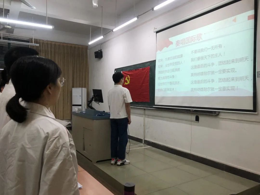全体党员同志起立,面向党旗,奏唱国际歌。