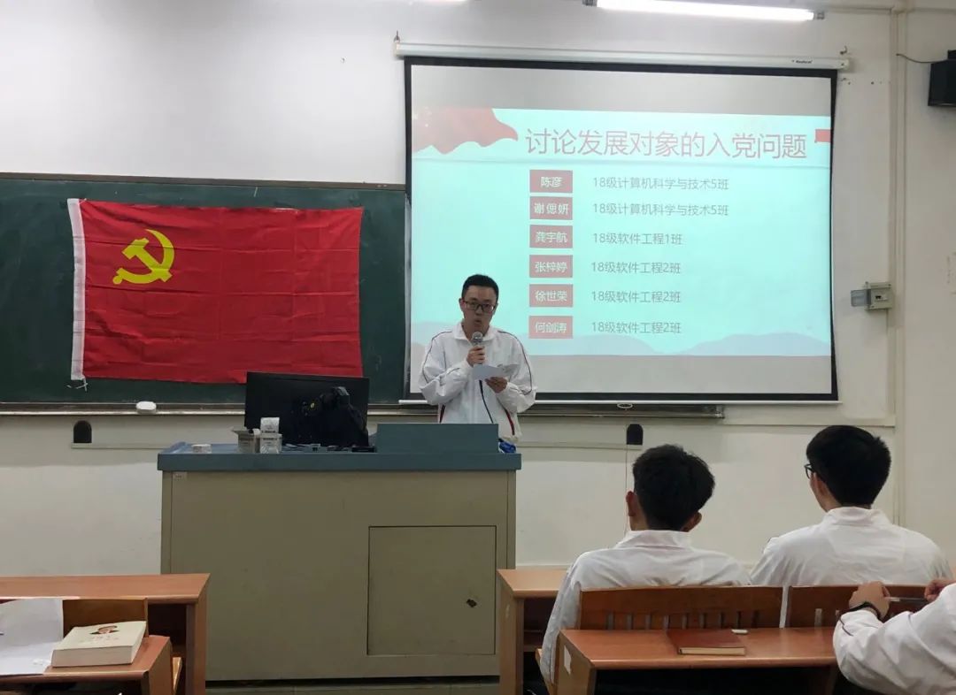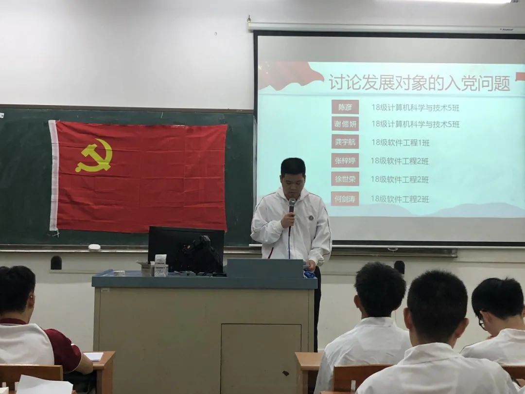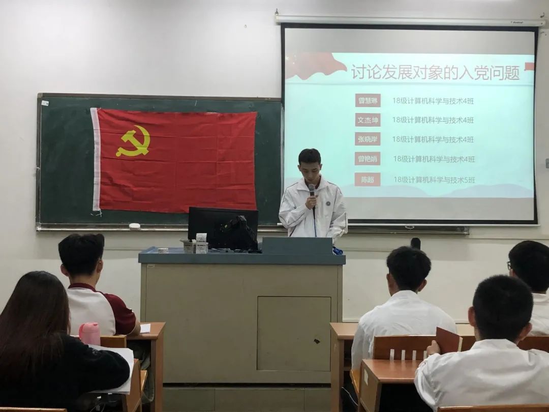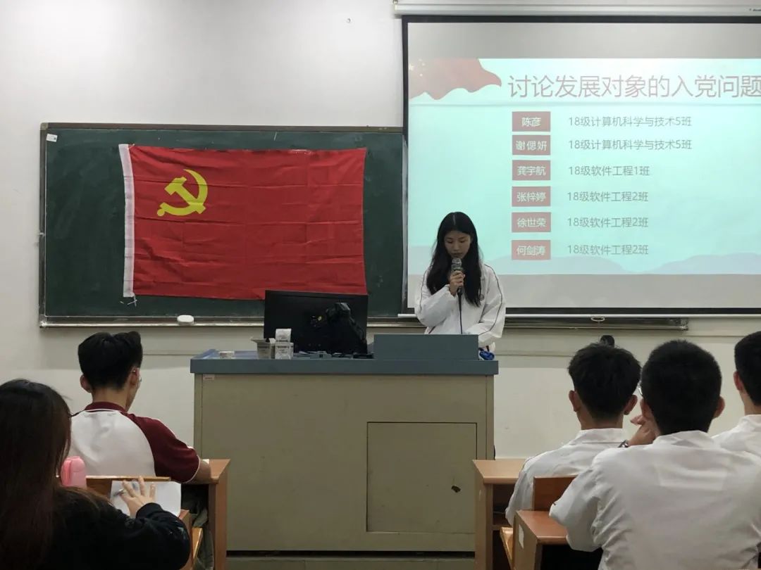 讨论发展对象的入党问题,16名发展对象依次上台宣读入党志愿书,他们将自己的具体信息和生活、学习等情况向党组织进行汇报,表示自己将会以党员的标准来严格要求自己,也希望自己可以在党组织的培养下,不断加强理论知识学习,严格践行党员标准,充分发挥党员的先锋模范作用。随后与会的正式党员讨论发展对象的发展问题,拥有表决权的党员逐一对16名发展对象进行不记名投票表决。经表决,一致同意接收汪逸秀等16名同志为中共预备党员。