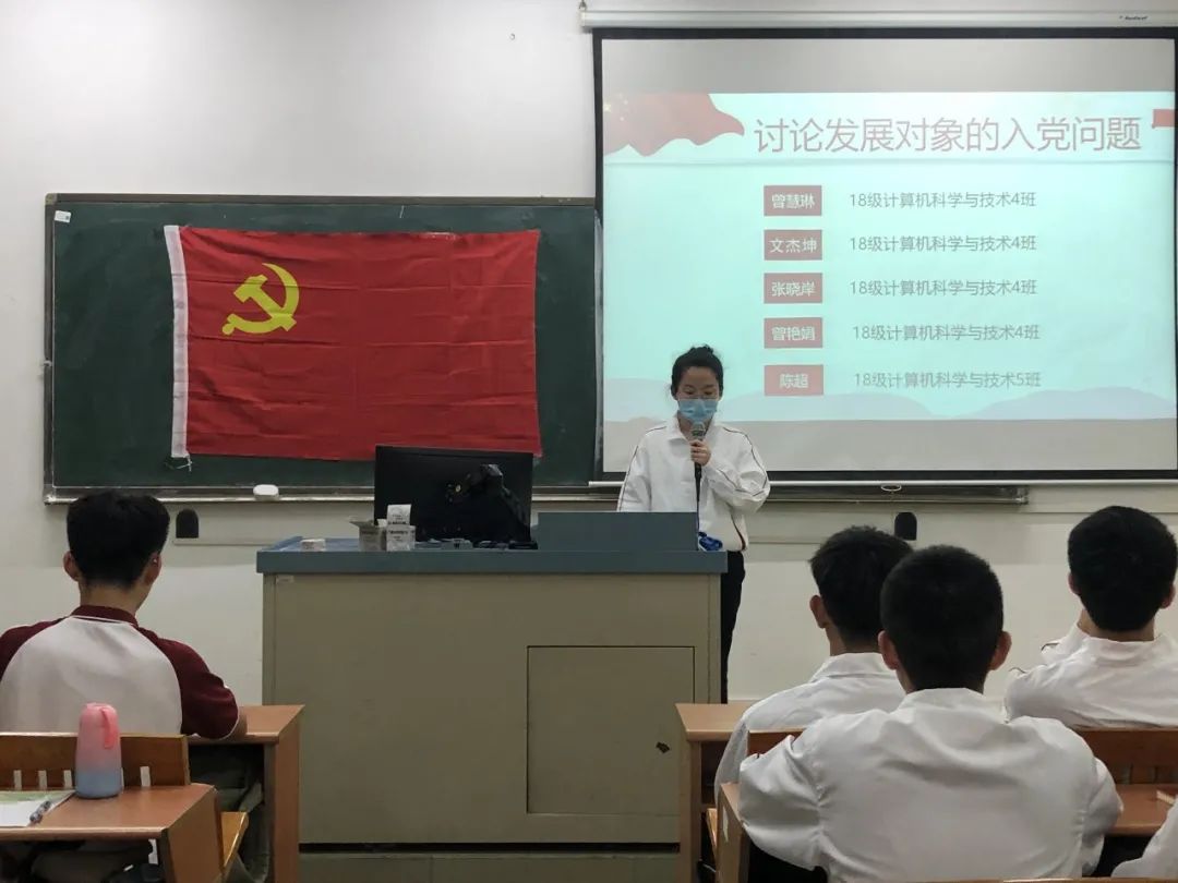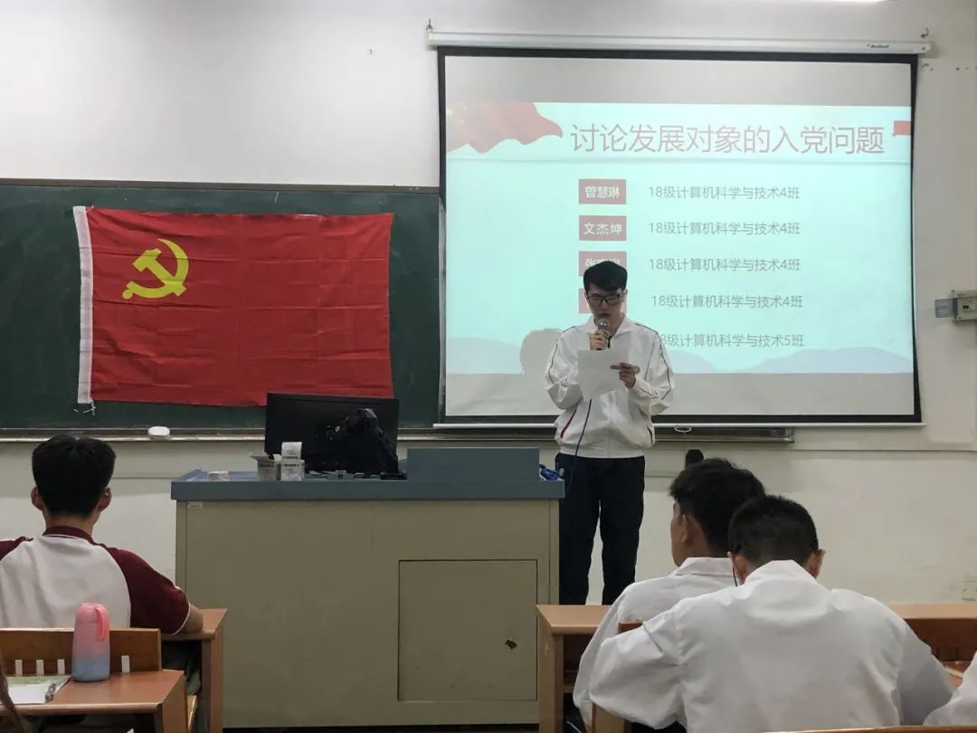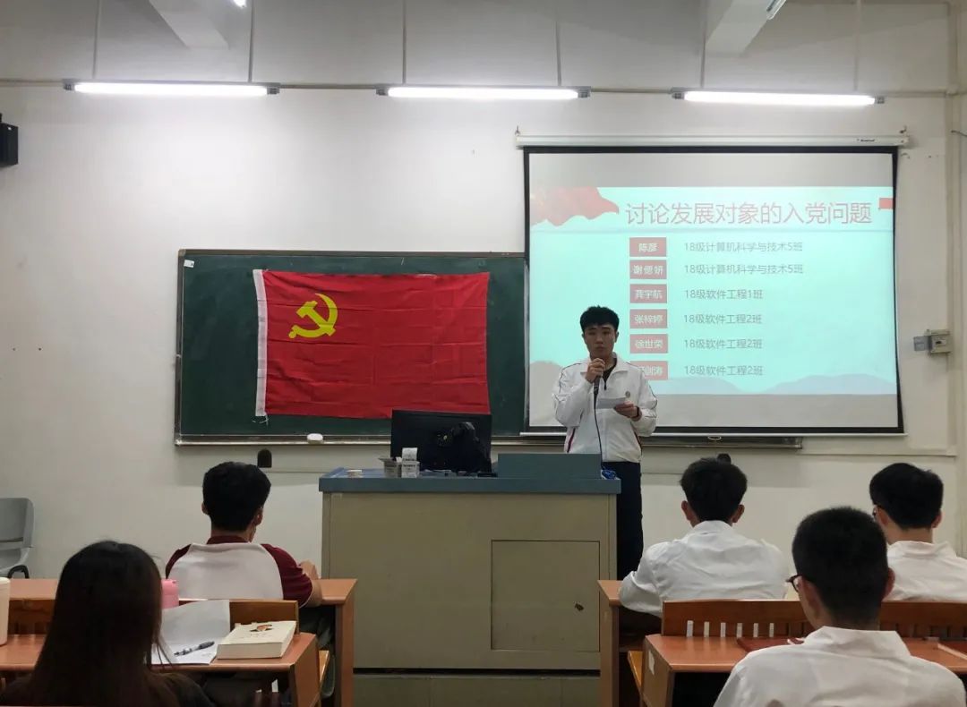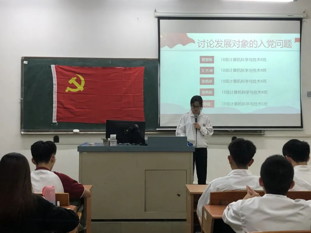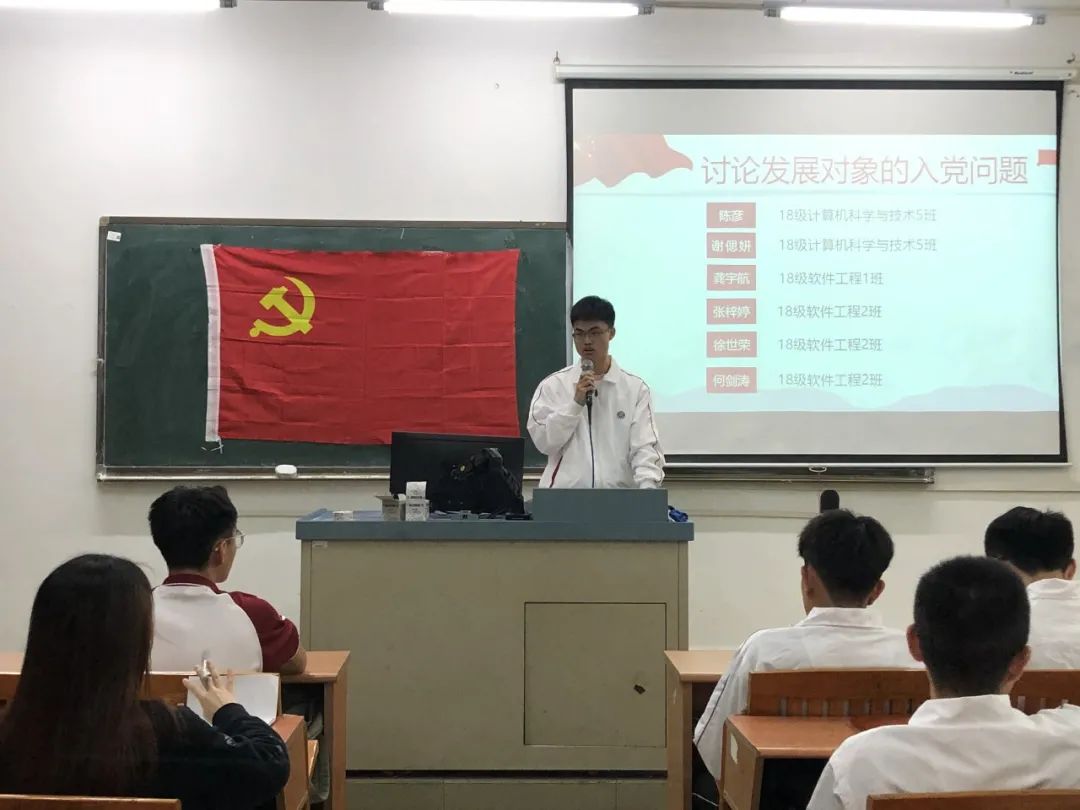 讨论发展对象的入党问题,16名发展对象依次上台宣读入党志愿书,他们将自己的具体信息和生活、学习等情况向党组织进行汇报,表示自己将会以党员的标准来严格要求自己,也希望自己可以在党组织的培养下,不断加强理论知识学习,严格践行党员标准,充分发挥党员的先锋模范作用。随后与会的正式党员讨论发展对象的发展问题,拥有表决权的党员逐一对16名发展对象进行不记名投票表决。经表决,一致同意接收汪逸秀等16名同志为中共预备党员。