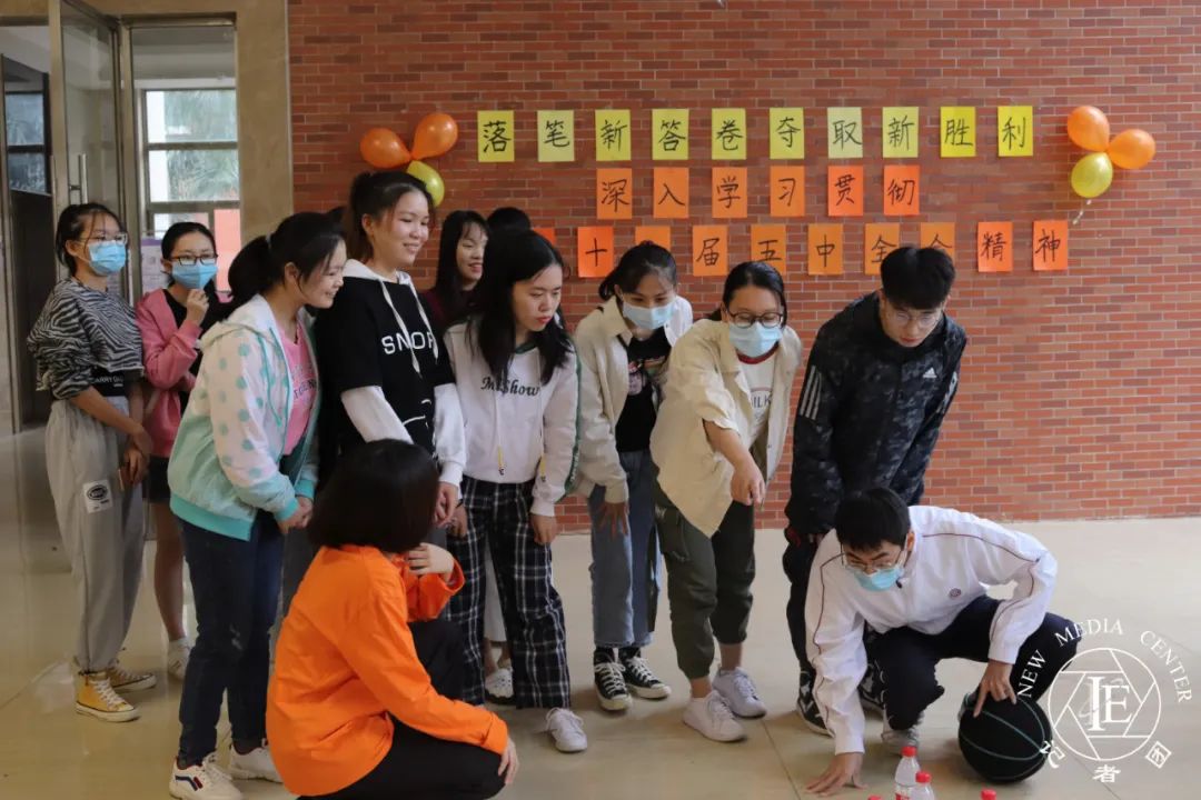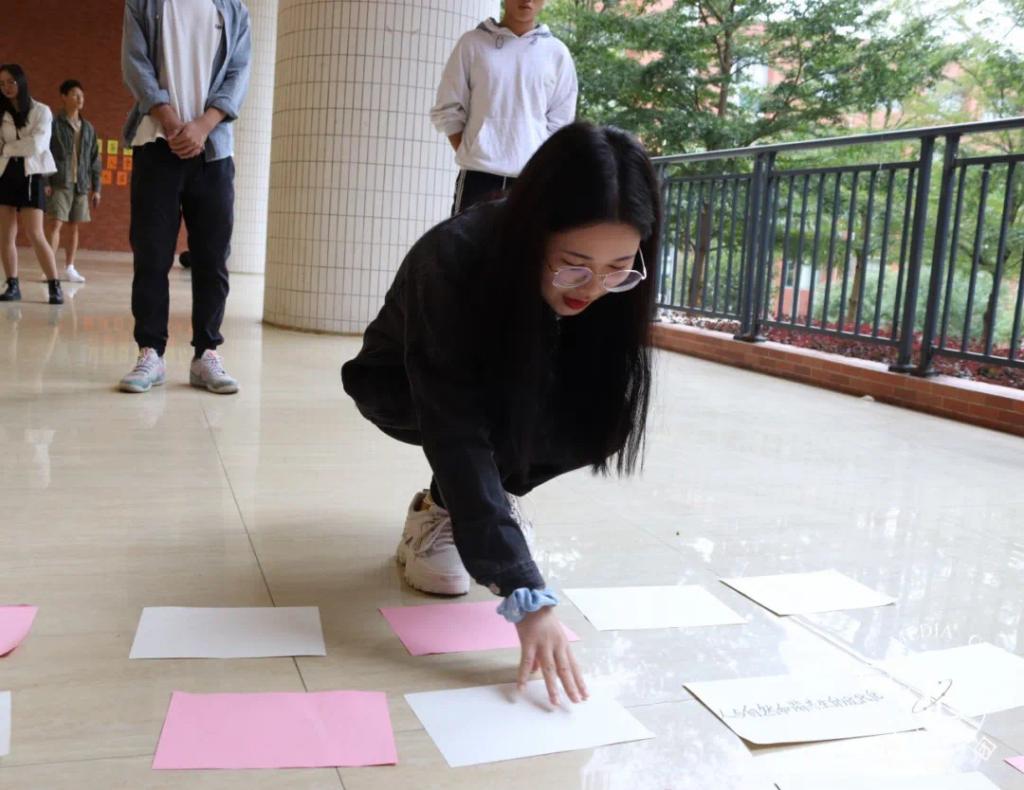 活动三:记忆识图。参与者需在90秒的时间内并记忆14张写有党的十九届五中全会关键词的卡片的位置,紧接着小组成员进行60秒的讨论后,派两名小组代表通过主持人提问进行举手抢答,每回答正确,所属小组可加一分。在记忆过程中,同学们都展开了紧张的“头脑风暴”,各小组成员根据卡片的颜色不同,分类记忆,在决胜环节展现了机智的一面;各小组代表在抢答过程中沉着冷静,记忆力惊人,将这场记忆识图活动比拼成“最强大脑”的对决。同学们在进行趣味活动的同时加深了对十九届五中全会的了解。