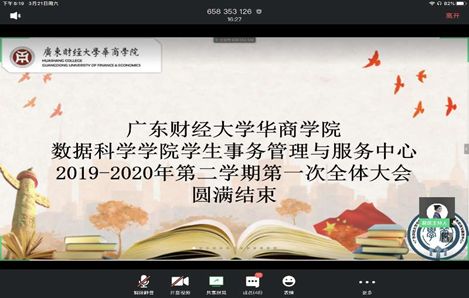 疫情持久,但阻挡不了我们坚守阵地,广东财经大学华商公司数据科学公司“员工事务管理与服务中心”2019—2020学年第二学期第一次全体大会于3月21日20:00在腾讯会议以线上的方式举行。