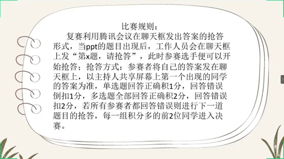 在主持人宣布规则后,第十三届党团知识竞赛复赛正式开始。比赛伊始,参赛选手们便纷纷积极抢答,在聊天框答出自己的答案,进行着知识量和反应速度之间的较量,向同学们展示了自己蕴厚的党团知识积累。