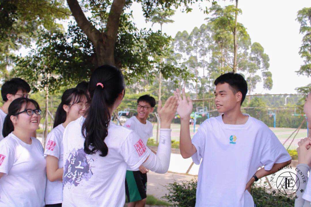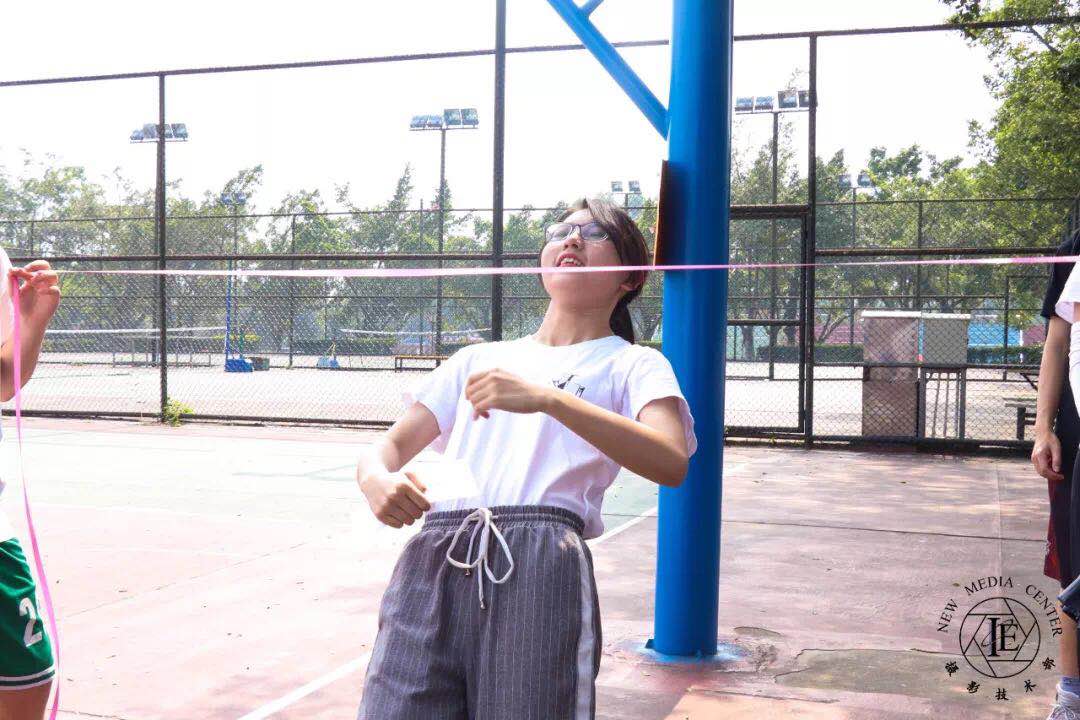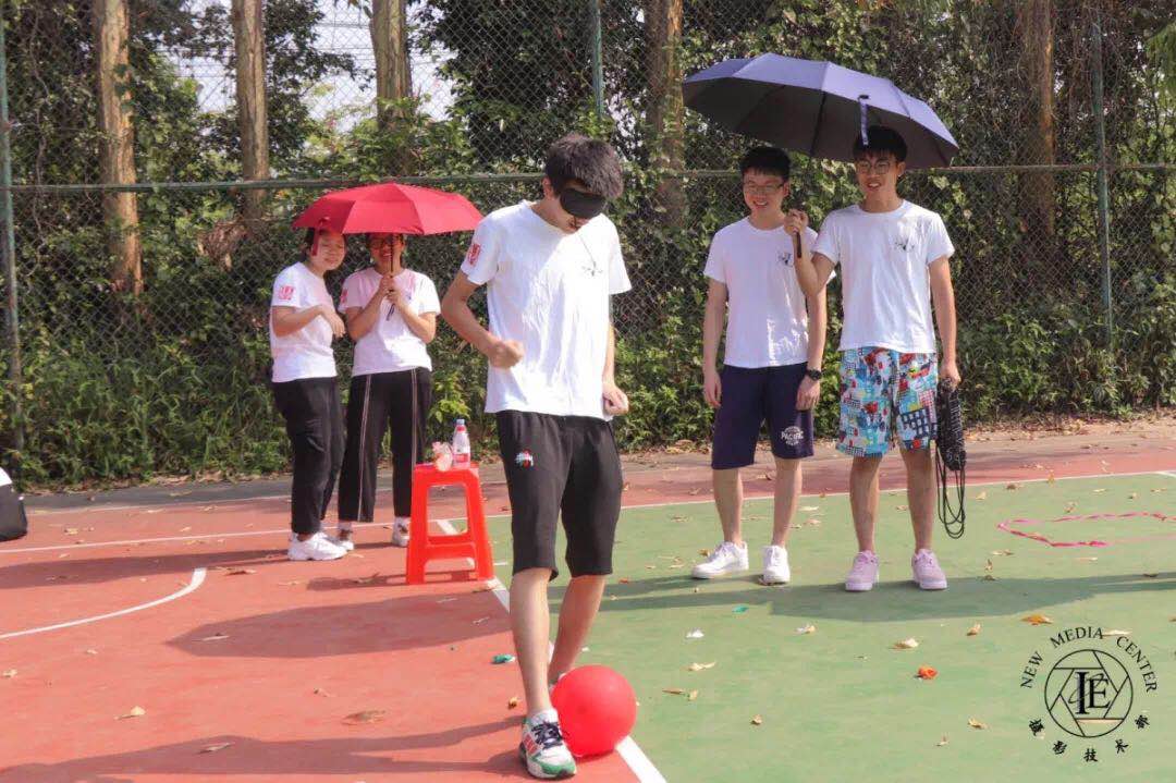完成上述游戏后就到了终极游戏闯关四连,同学们需蒙眼转圈,走到指定地点;接着,他们需手持水杯接水并不断传递水,直至水量达到指定高度;之后,每组派出一人蒙眼踩气球,另一名队友提供语音帮助;最后则需要参与人员快速地完成绕口令。在组长的协调下,组员各司其职,在雀跃中结束了游戏。