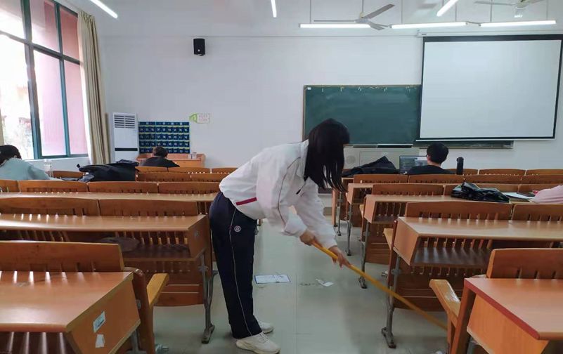 在清扫期间,每一位志愿者都秉承着吃苦耐劳的精神以及细心负责的态度来完成这项工作。在志愿者们长达两个半小时的清扫活动中,他们积极清扫垃圾,不怕脏、不喊累,兢兢业业,互相配合,最终他们用自己的实际行动为教室的环境增添了一份清、一抹明亮。他们每一次弯腰的姿态都写满了认真和努力。