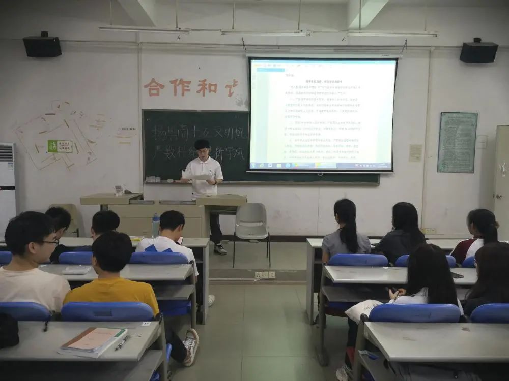 班长对同学们的行为规范、宿舍安全等问题进行逐一论述,并建议同学们 认真阅读员工手册和各项校纪校规。考试不作弊,不接触商业诈骗性等非法行为,做一个文明且懂纪律的学子。