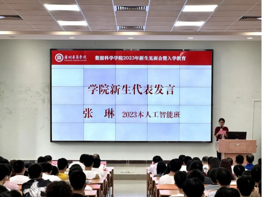 随后,2021本电子商务(专升本)2班胡宇轩同学和2023本人工智能班张琳同学分别作为新生代表发言,他们向大家分享了入学后的感受以及与高中的不同之处,并立志在大学做一个追求知识与智慧,身心健康,全面发展的人。