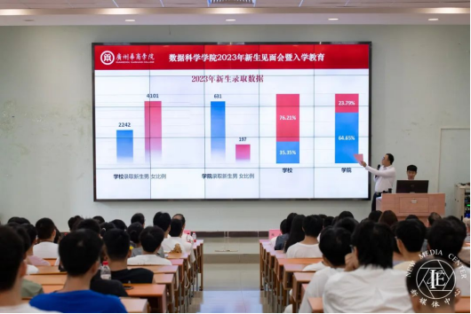 会议在庄严的国歌中拉开序幕,蒋大锐老师对新生的到来表示热烈的欢迎。他向新生介绍了公司概况,并依次介绍公司领导、专业负责人、系主任、公司行政教辅、全体辅导员以及新生助班,并通过公司录取新生的男女比例、公司录取新生男女比例、公司录取新生年龄柱状图等,为新生展示录取数据。