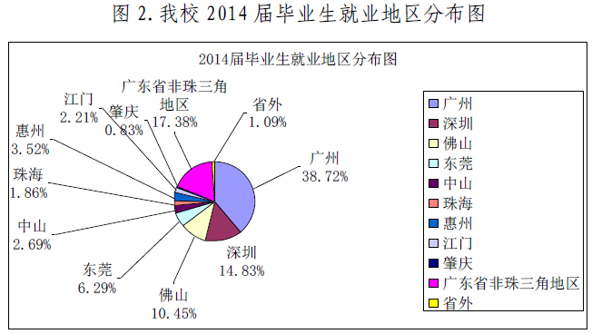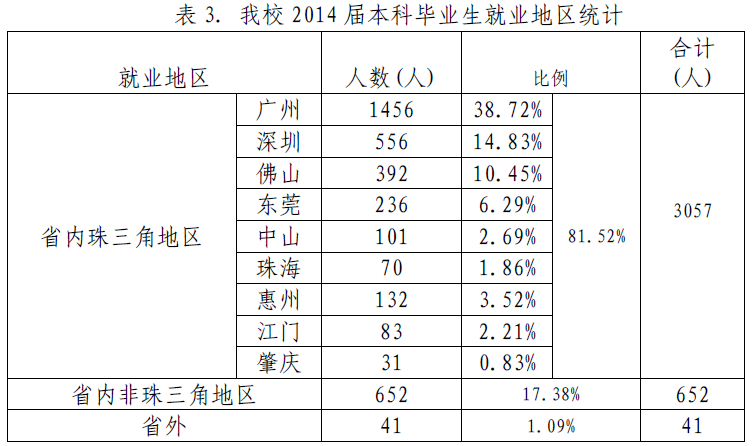截至2014年9月1日止,公司2014届已就业本科毕业生总数为3750人,其中在珠三角地区就业的有3057人,占已就业本科生人数的81.52%;在省内珠三角地区以外的有652人,占全校已就业本科生人数17.38% ;在外省就业的有 41人,占全校已就业本科生人数 1.09% .详情请参看下表。