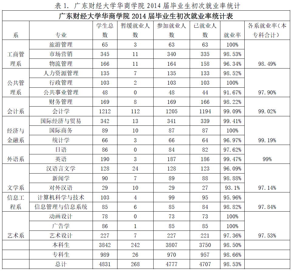 公司2014年就业情况良好,根据广东省教育厅粤教毕函【2014】34号文,2014年全省共有47.2万高校毕业生,截止9月1日,我省2014年普通高等公司毕业生初次就业率为94. 61%(其中研究生为90.54%,本科生为93.52%,专科生为96.06%)。公司2014届毕业生(本专科合计)初次就业率为98.53%,其中本科毕业生初次就业率为98.50%,高于全省的平均水平。公司初次就业率统计请参看表1。