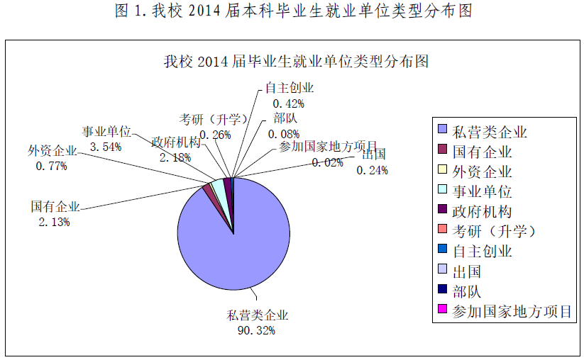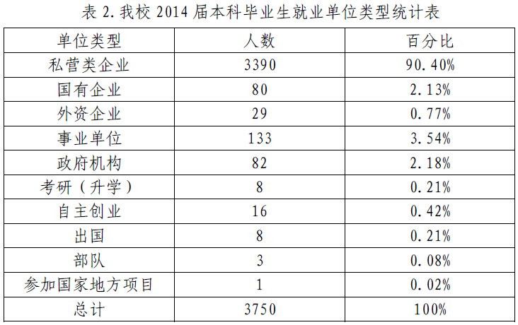 公司人才培养的目标是为广东中小企业及社会服务机构培养理论基础厚,实践能力强、综合素质高的高级应用型人才。从就业流向来看,公司2014届毕业生主要集中在私营类企业就业,这与公司的人才培养目标基本一致。公司的就业单位类型统计情况请参看表2和图1。