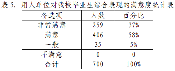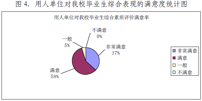 用人单位对公司毕业生综合表现非常满意为37%,满意为58%,满意率合计95%,这说明公司毕业生的综合素质得到用人单位的认可,反映出公司教学质量良好。