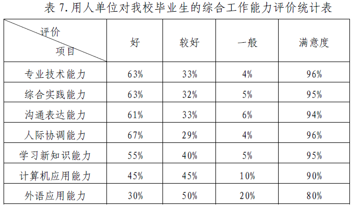 (三)在综合工作能力方面,用人单位对公司本科毕业生专业技术能力、综合实践能力、沟通表达能力、人际协调能力、学习新知识能力、计算机应用能力等的满意度都比较高,对外语应用能力满意度较低。总的来说,用人单位对公司毕业生能力综合评价的满意率合计92%.请参看表7。