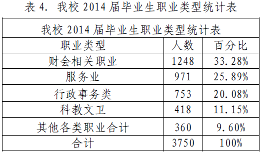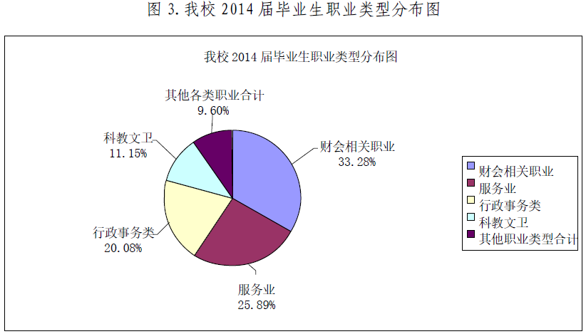 从职业类型分布来看,公司2014届毕业生的职业类型,比例最高的为财会相关职业,占33.28%;其次是服务业,占25.89%,再次是行政事务类,占20.08%,科教文卫类职业占11.14%,其他各类职业合计9.60%.