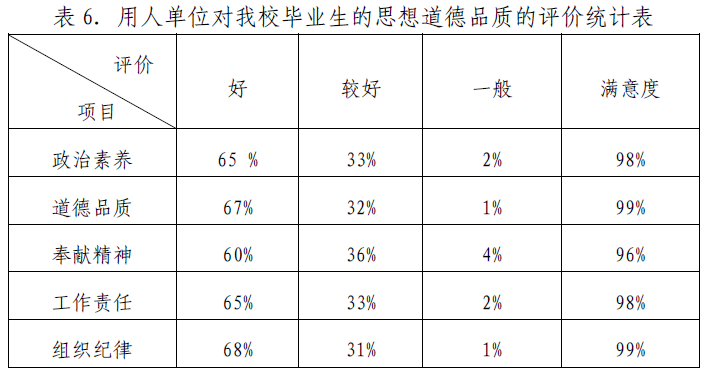 (二)在思想道德品质方面,用人单位对公司本科毕业生各方面评价均比较高:政治素养、道德品质、奉献精神、工作责任、组织纪律等满意度均在95%以上。请参看表6。