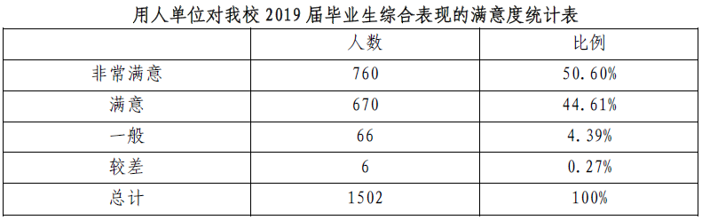 用人单位对公司毕业生综合表现非常满意为50.6%,满意为44.61%,满意度合计96%,这说明公司毕业生的综合素质得到用人单位的认可,反映出公司教学质量良好。