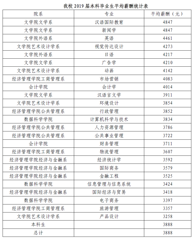 老员工就业在线院校应用系统中的数据显示,公司2019年毕业生的平均薪酬约为3888元,其中最高的是汉语国际教育和新闻学专业,平均薪酬4847元;其次是英语,为4461元;再次是视觉传达设计,为4273元。因为此项数据统计时间刚好为毕业生入职的实习期或者试用期,数据显示为毕业生的入职工资,比毕业生实际薪酬低。具体数据见下表。