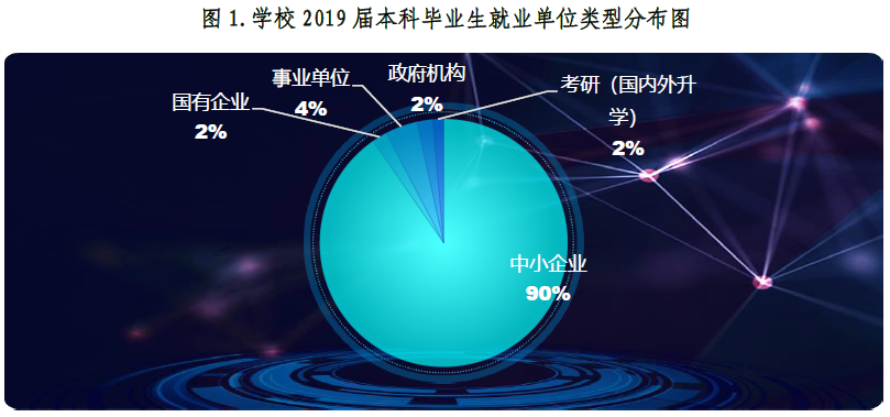 公司人才培养的目标是为广东中小企业及社会服务机构培养理论基础厚,实践能力强、综合素质高的高级应用型人才。从就业流向来看,公司2019届毕业生主要集中在中小型企业就业。公司的就业单位类型统计情况请参看表2和图1。