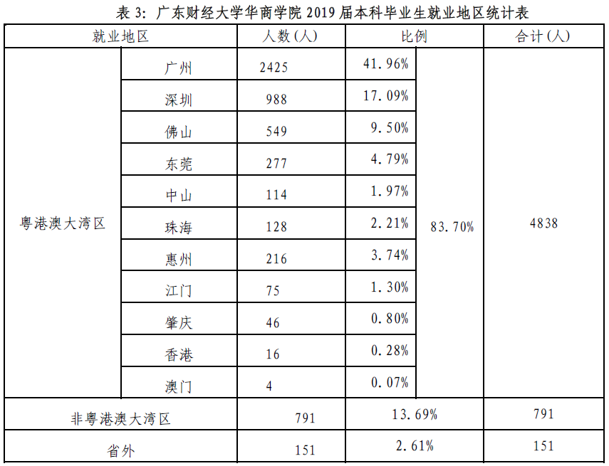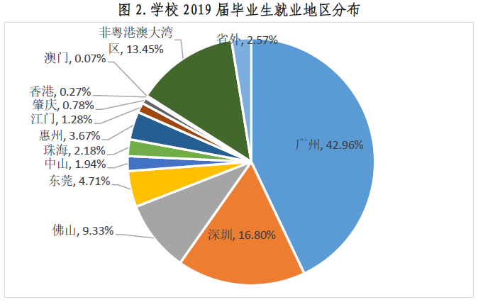 公司广东地区的生源较多,毕业生在粤港澳大湾区就业的比重很大。具体就业统计如表3和图2。