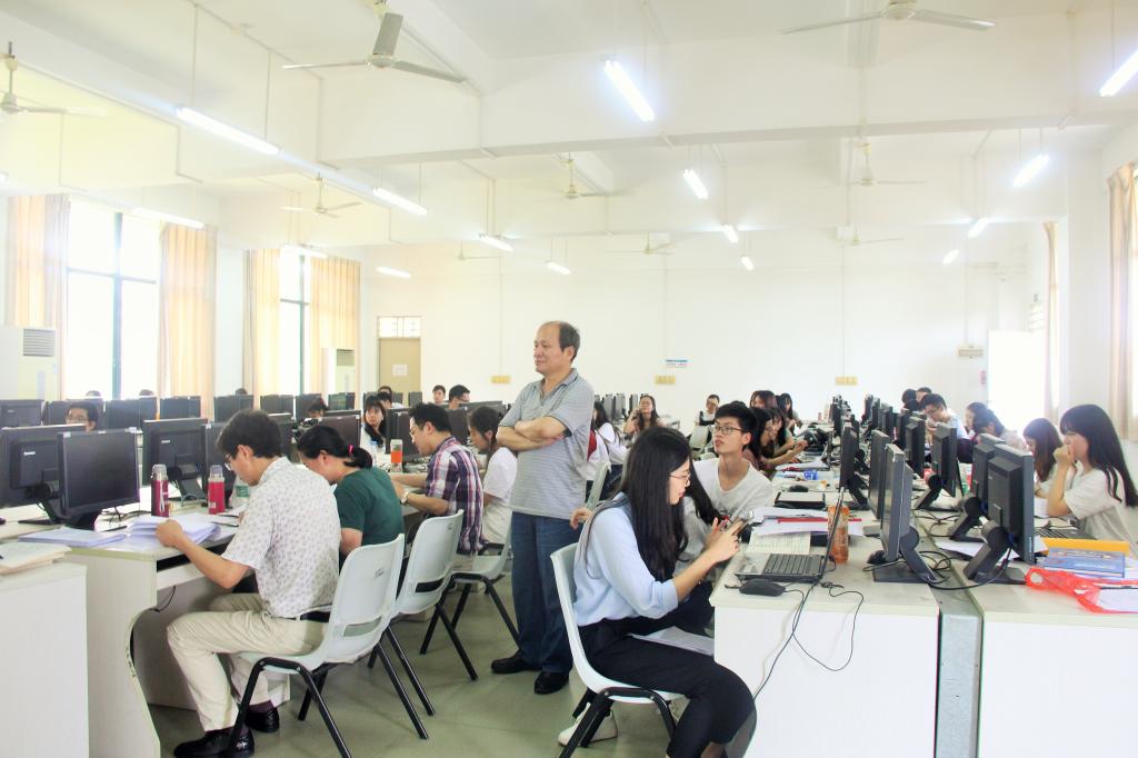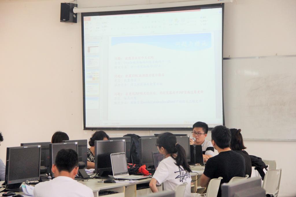 在厚德楼A202及A203进行的是2013级计算机科学与技术专业的毕业生论文答辩。在工作人员的配合下,答辩在紧张的氛围中有序展开,同学纷纷展示自己所设计的系统并加以简洁的语言向老师演示与解说,精彩的展示吸引了不少2014级与2015级的员工前来观摩,而老师们亦结合现实与操作上系统的缺陷给予精准的点评。