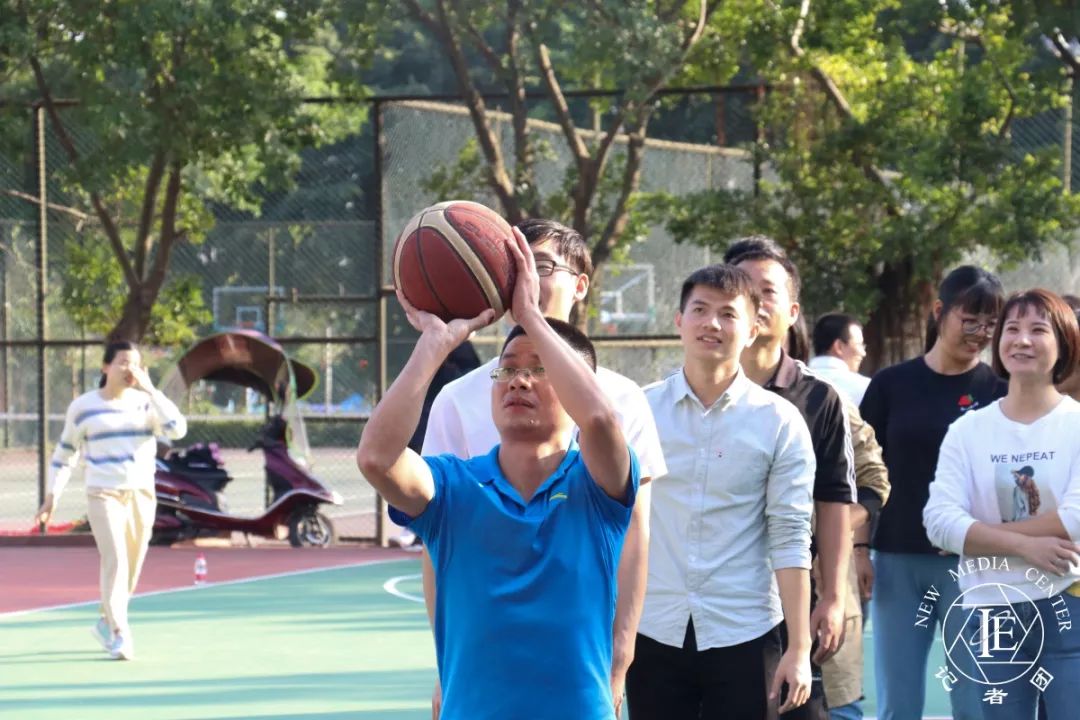 老师们排着队,向上跃起掷出篮球。每当篮球投进框内,老师们都显得格外开心,这让老师向来严肃的形象增添一丝光彩。