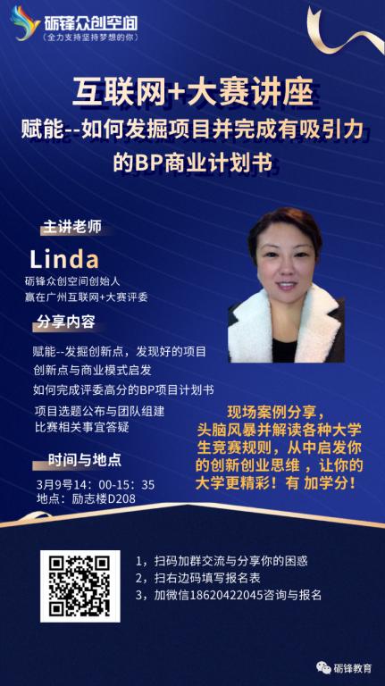 3月7-8号,砺锋众创空间负责人linda为同学们开展了“赋能--让你的项目得到评委的青睐”为主题的讲座。