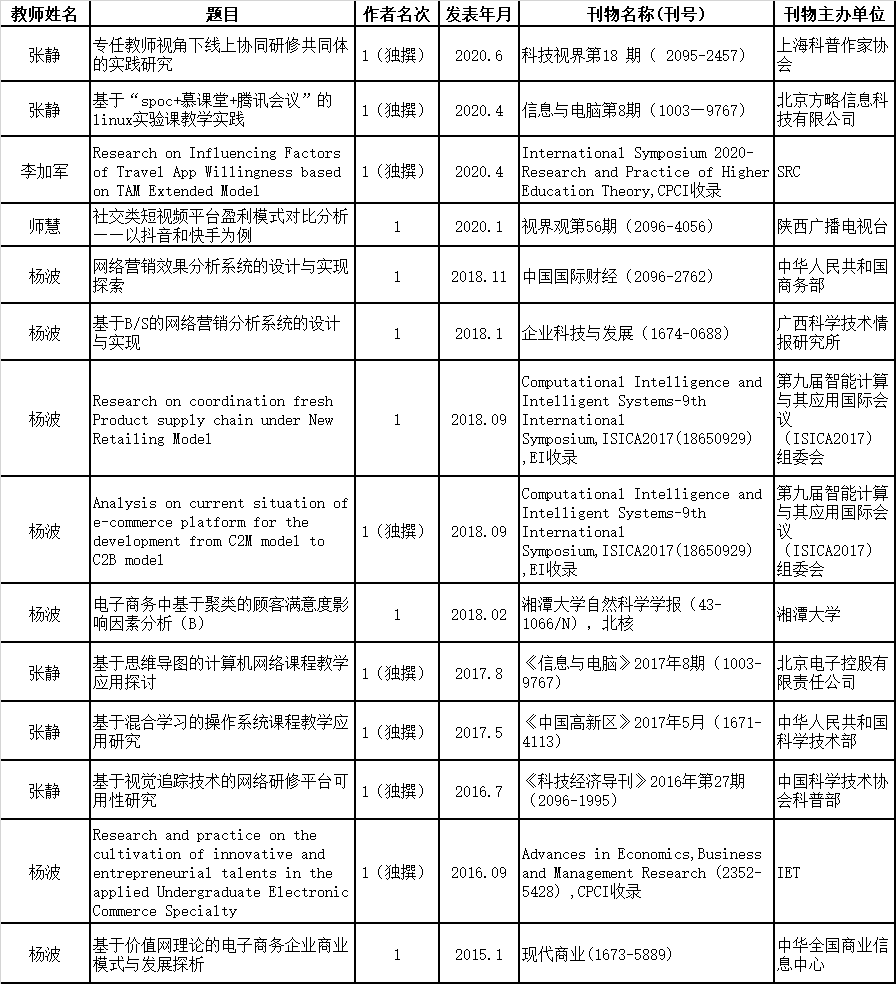 热点新闻 当前位置: 首页 >> 正文 电子商务专业各类科研、教研项目和成果 2024-07-01 一、教、科研项目 二、公开发表论文情况 三、公开出版教材 四、申请专利 五、与外校合作的教研项目 公司参与母体公司建设的首批省级系列在线开放课程。 上一条:关于公布 2020 年数科院第一批员工工作室科研项目立项的通知 下一条:大学青年教师如何处理教学和科研的关系 【关闭】