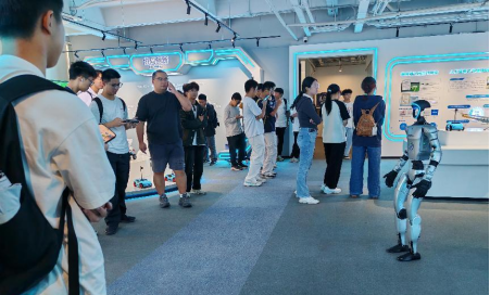 在图灵智新企业展厅,讲解员为同学们系统介绍了企业发展历程,重点展示了在智慧媒体、智慧教育和智慧交通等领域的技术成果与落地案例。师生们还亲身体验了"萝卜快跑"自动驾驶服务,参观并操作了机器狗、人形机器人等智能设备,直观感受了人工智能技术的创新应用。