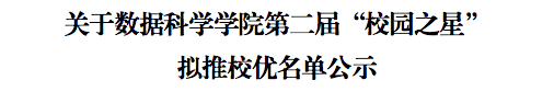 以上拟表彰名单公示期限从2023年3月21日到2023年3月23日,在以上公示期,若发现公示对象存在不符合评选条件的,可向数据科学公司学工办反映。联系电话:020-26222963,特此公示!