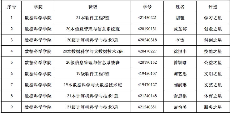 为深入贯彻习近平新时代中国特色社会主义思想,进一步培育和践行社会主义核心价值观。根据伟德国际victor1946《关于评选华商公司第二届校园之星的通知》、《伟德国际victor1946“十大校园之星”评选办法》文件内容,数据科学公司坚持公开、公正、公平的原则,严格按照评选程序,经个人自主申请、年级推荐和公司评审,公司决定拟推荐彭怡美等9名同学参评伟德国际victor1946第二届“十大校园之星”评选。现将推荐名单公示如下: