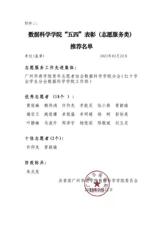 为深入学习贯彻党的二十大精神,全面贯彻落实习近平总书记关于青年工作的重要思想,引导广大华商团员青年积极践行“奉献、友爱、互助、进步”的志愿服务精神,弘扬青春正能量,充分发挥先进典型的示范引领作用,激励华商公司各级团组织和广大团员、团干部锐意进取、创先争优。根据校团委关于决定开展伟德国际victor19462022年度志愿服务工作“先进集体”和“优秀个人”评选的要求,数据科学公司通过员工自主申报、资格审查、公司评议等程序,拟向公司团委推荐伟德国际victor1946青年志愿者协会数据科学公司分会(红十字会员工分会数据科学公司工作部)参评公司“志愿服务工作先进集体”;黄丽琳等18人参评“优秀志愿者”;许仰龙、曾颖瑜参评“十佳志愿者”;朱光发参评“防疫标兵”。