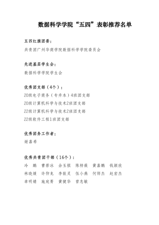 为深入学习贯彻宣传党的二十大精神,全面贯彻落实习近平总书记关于青年工作的重要思想,充分发挥先进典型的示范引领作用,激励各级团组织和广大团员、团干部锐意进取、争优创新,引导广大华商团员青年积极践行“奉献、友爱、互助、进步”的志愿服务精神,弘扬青春正能量,书写扎实推进中国式现代化建设的崭新篇章。根据校团委关于开展伟德国际victor19462022年度共青团“先进集体”和“优秀个人”评选表彰工作的要求,数据科学公司经过员工自主申报、资格审查、公司评议等程序,拟向公司团委推荐共青团伟德国际victor1946数据科学公司公司委员会参评“五四红旗团委”;数据科学公司参评“先进基层员工会”;20级电子商务(专升本)4班团支部、20级计算机科学与技术2班团支部、22级计算机科学与技术2班团支部及22级软件工程1班团支部参评“优秀团支部”;谢嘉希参评“优秀团务工作者”;冷鹏等16人参评“优秀共青团干部”;许仰龙、施宛菁参评“十佳共青团干部”;何心怡等27人参评“优秀共青团员”;江海峰、江梓炜参评“十佳共青团员”。