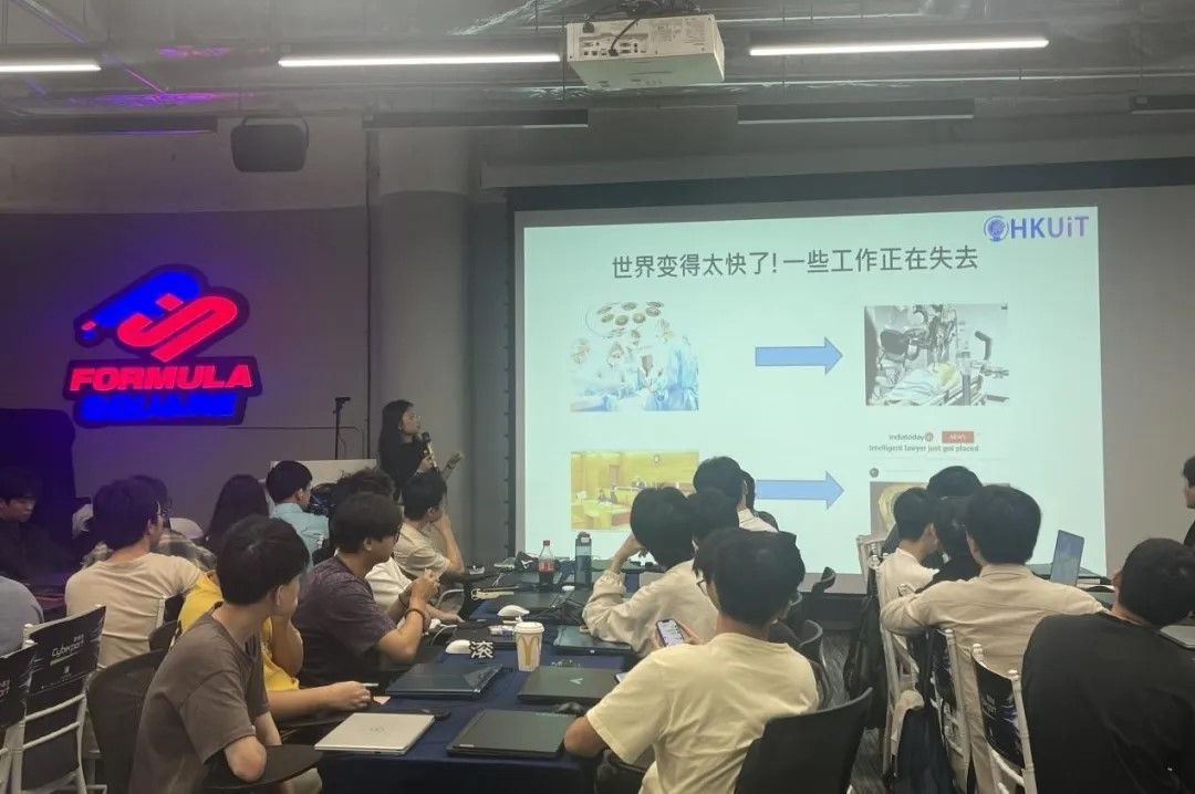 第一站我们来到了香港中文大学深圳研究院。在这里我们上了研学的第一堂课。听主讲人AI阿波为我们讲述Midjourney的使用教程,这是专门为初学者设计的AI软件入门课程,通过实践操作让员工了解和掌握人工智能的基本概念和应用。一个半小时的课时说长不长说短不短却让同学们都受益匪浅。