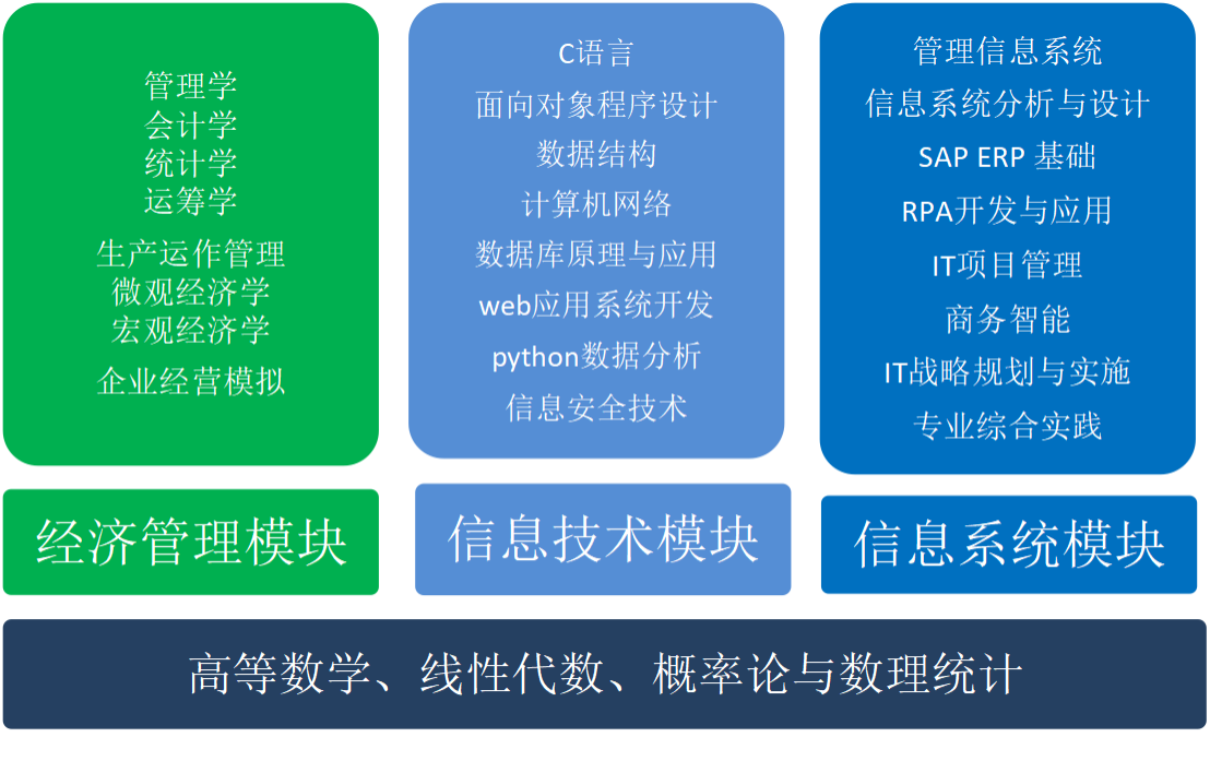 课程体系包括通识教育课(43%),学科基础课(16%),专业课(29%),综合运用课(12%)。通识课之外的专业课程由经济管理、信息技术、信息系统三大模块组成,各模块主要课程如图1所示。