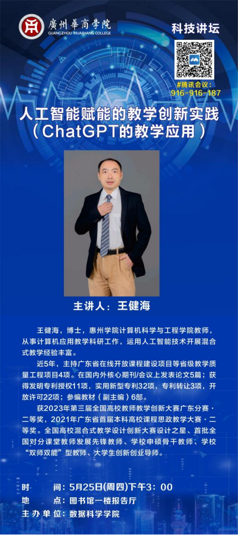 2023年5月25日,伟德国际victor1946数据科学公司邀请到惠州公司计算机科学与技术公司王健海博士为师生们做了一次精彩的讲座。本次讲座的主题为“人工智能赋能的教学创新实践”,王博士以《数字逻辑》为例,结合他运用ChatGPT在课程教学创新所取得的实践经验,深入浅出地探讨人工智能技术在教育领域的应用和未来发展趋势。该讲座受到了广大师生的热烈欢迎。