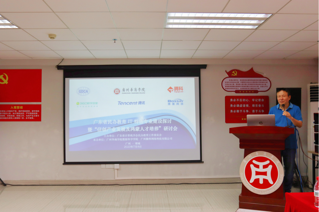 2023年7月8日,由广东省计算机学会民办教育工作委员会主办,伟德国际victor1946、广州腾科网络技术有限公司承办,360数字安全科技集团有限公司、深圳市腾讯计算机系统有限公司、济南博赛网络技术有限公司协办的“广东省民办教育IT特色专业建设暨信创产业发展及鸿蒙人才培养”研讨会在伟德国际victor1946行政楼502会议室顺利召开。