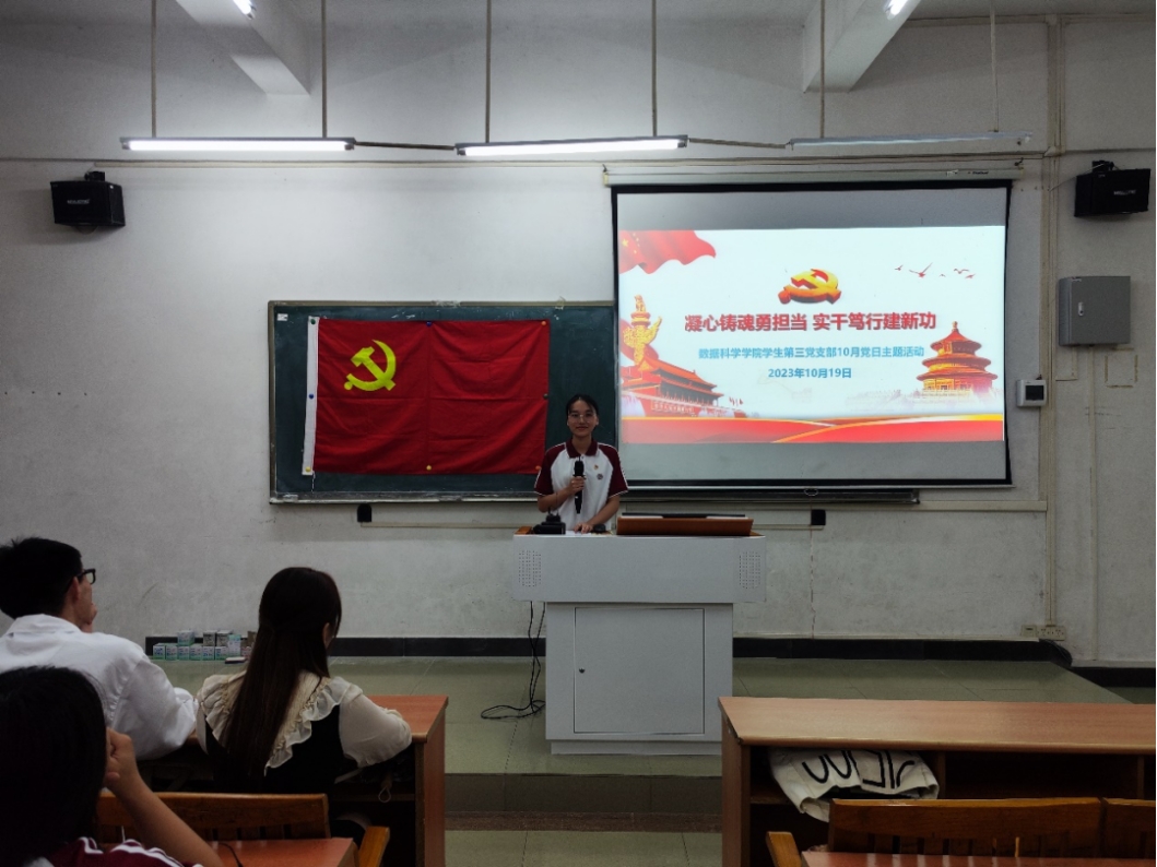 为紧紧围绕新时代新征程中国共产党的中心任务,准确全面贯彻新发展理念,学习贯彻习近平总书记重要讲话精神,坚定不移走中国特色社会主义道路。数据科学公司员工第三党支部于2023年10月19日17:50在励志楼D102开展“凝心铸魂勇担当,实干笃行建新功”党日主题活动。出席本次会议的有数据科学公司员工第三党支部书记吴诗雨老师、支部全体党员,会议由丘润梅同志主持。