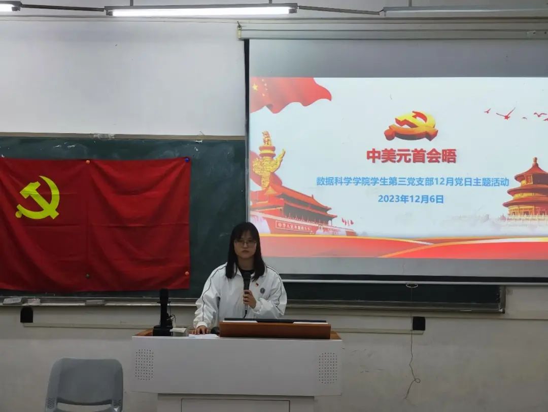 为紧紧围绕中美关系的战略性、全局性、方向性问题以及事关世界和平和发展的问题,深刻学习相互尊重、和平共处、合作共赢历程中提炼出的经验。数据科学公司员工第三党支部于2023年12月6日18:30在励志楼D102开展“中美元首会晤”党日主题活动。出席本次会议的有数据科学公司员工第三党支部书记吴诗雨老师、支部全体党员,会议由黄秋格同志主持。