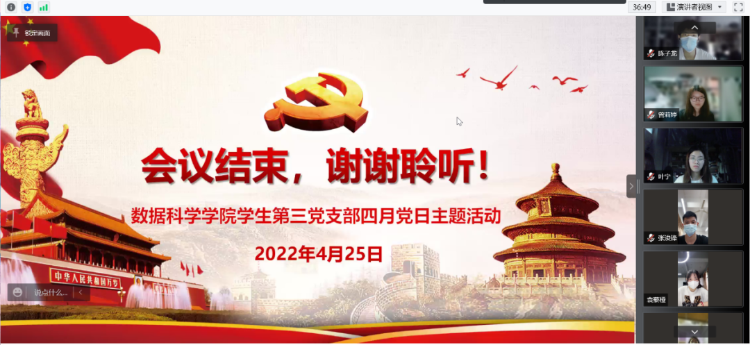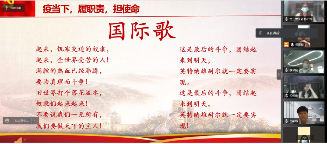 为落实“三会一课”制度、加强党员教育管理、促进党员发挥先锋模范作用,结合当前疫情防控形势,数据科学公司员工第三党支部于2022年4月25日以线上的方式开展“疫当下,履职责,担使命”党日主题活动。参与本次会议的有数据科学公司员工第三党支部书记官志豪老师以及支部全体党员,会议由李嘉乐同志主持。