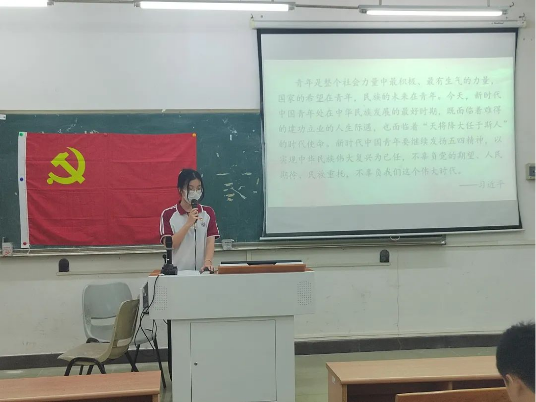 许楚婷同志首先带领参会人员学习了五四精神的核心内容和五四运动的历史意义。五四精神的核心内容为“爱国、进步、民主、科学”。爱国主义是五四精神的源泉,民主与科学是五四精神的核心,勇于探索、敢于创新、解放思想、实行变革是民主与科学提出和实现的途径,理性精神、个性解放、反帝反封建是民主与科学的内容。历史指出:五四运动是20世纪初叶中国历史发展上一件具有划时代意义的重大事件,对20世纪中国的政治、文化、思想,乃至社会生活都产生了极其深远的影响。