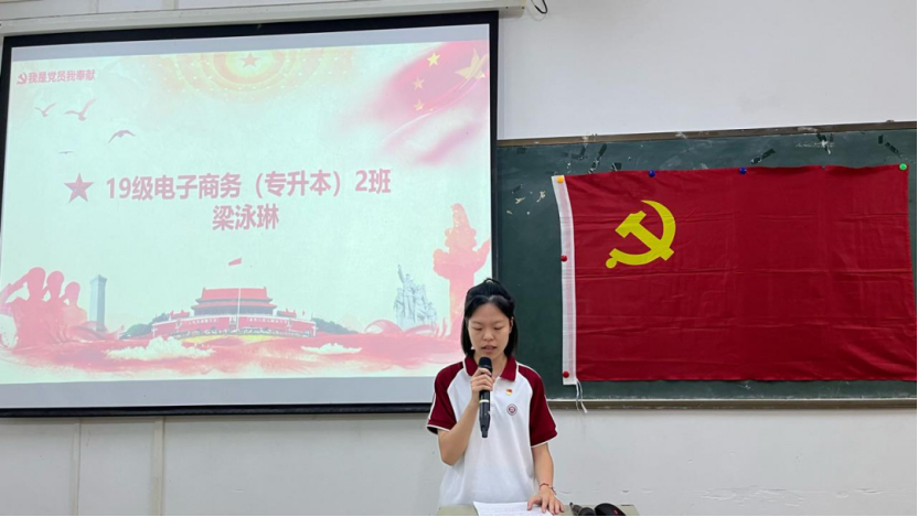 本期转正大会的预备党员梁泳琳同志上台宣读转正申请书,详细汇报了自己在预备时期的学习、生活和工作等表现并作出总结,表达了入党的意愿和决心。