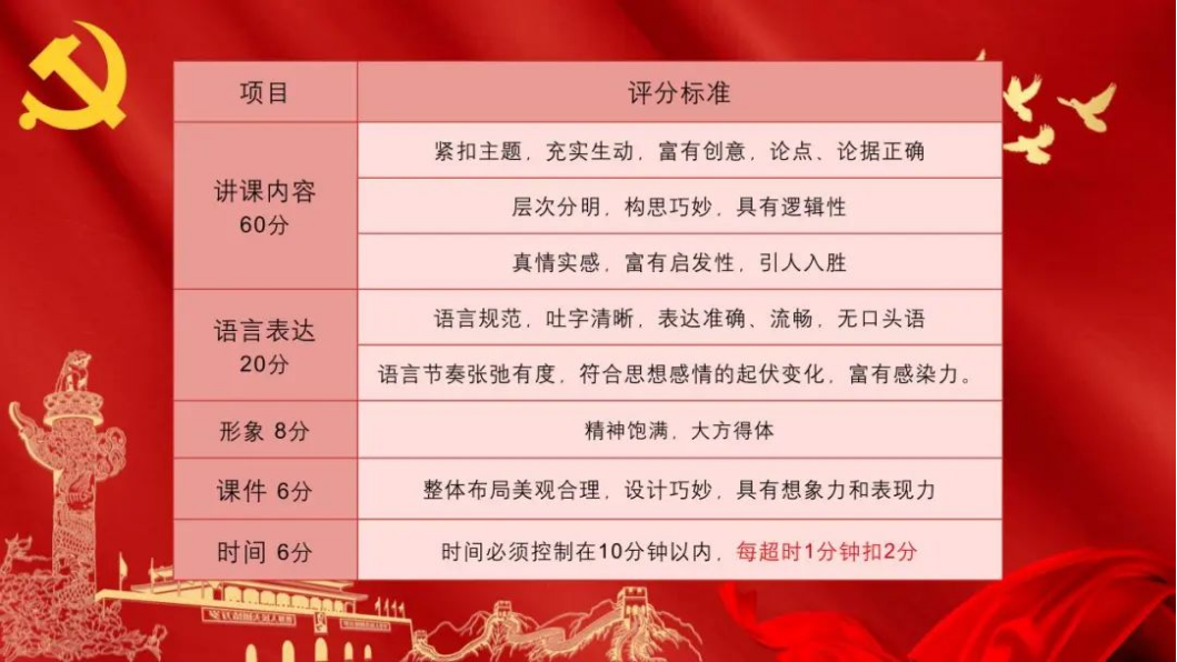 首先由主持人介绍初赛比赛规则。参赛选手按照事先的抽签顺序,依次上台用6-8 分钟讲述微党课,评委老师根据参赛选手的讲课内容、语言表达、仪表风范、课件设计、时间控制进行评分,工作人员统计后由主持人现场公布成绩。比赛共设置第一名1名、第二名1名、第三名1名、优秀奖2名。