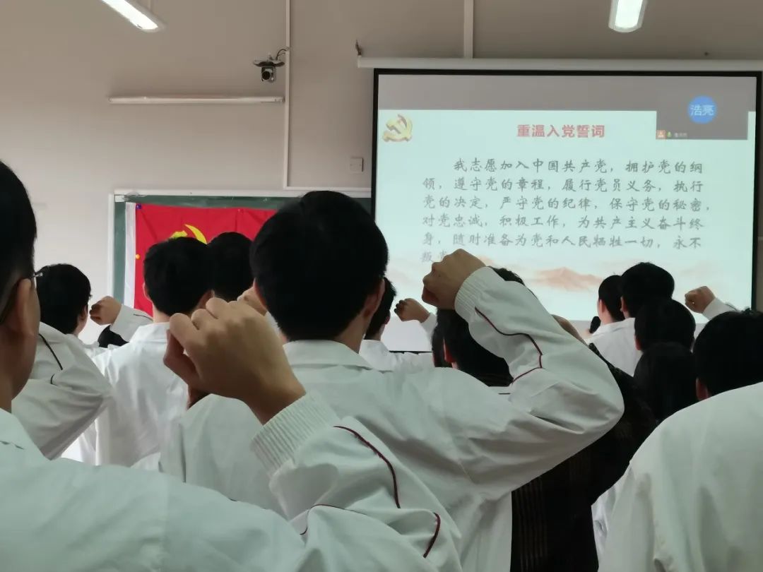 新党员在张校清同志的带领下,举起右拳,面向党旗,庄严宣誓:我志愿加入中国共产党,拥护党的纲领,遵守党的章程,履行党员义务,执行党的决定,严守党的纪律,保守党的秘密,对党忠诚,积极工作,为共产主义奋斗终身,随时准备为党和人民牺牲一切,永不叛党。