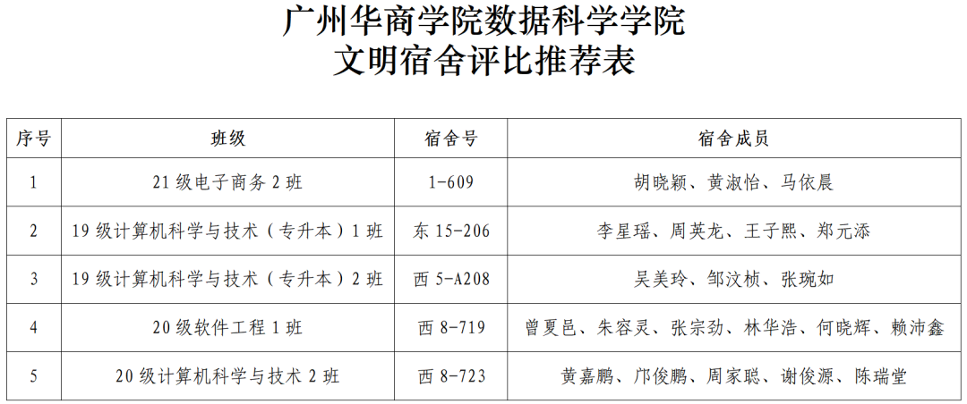 活动开展中,公司涌现出一批干净整洁、舒适安全、舍风优良的典型宿舍,为表彰先进,树立典范,通过自主报名、实地督查、量化考核等程序,经公司研究决定,拟推荐四会校区1-609、增城校区东15-206等5间宿舍参评公司“文明宿舍”称号,现将具体名单公示如下: