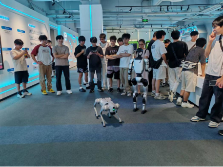 在体验等待间隙,同学们还前往二楼参观并试玩了机器狗和人形机器人,这些机器人能够自主导航、避障,并具备物体识别和抓取功能。