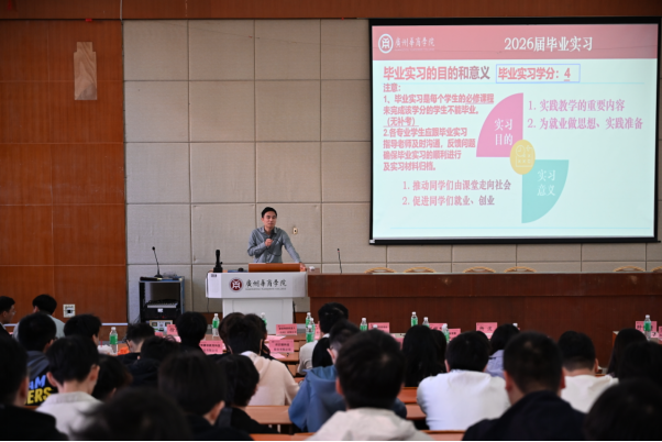 杨本胜院助随后聚焦毕业实习与毕业论文两大核心事宜。他指出毕业实习为必修课程,时间为 2026 年 3 月 2 日至 4 月 26 日共 8 周,需在 2 月 25 日前落实专业相符的实习单位,提交实习手册、申请表等材料,且材料中单位名称与印章需一致,实习期间每月 24 日前需向指导老师汇报就业情况;毕业论文需严守学术规范,重复率低于 25% 方可答辩,1 月 17 日前提交初稿,每周需与指导老师沟通进度,避免抄袭与 AI 生成内容,确保质量应对教育部抽检。