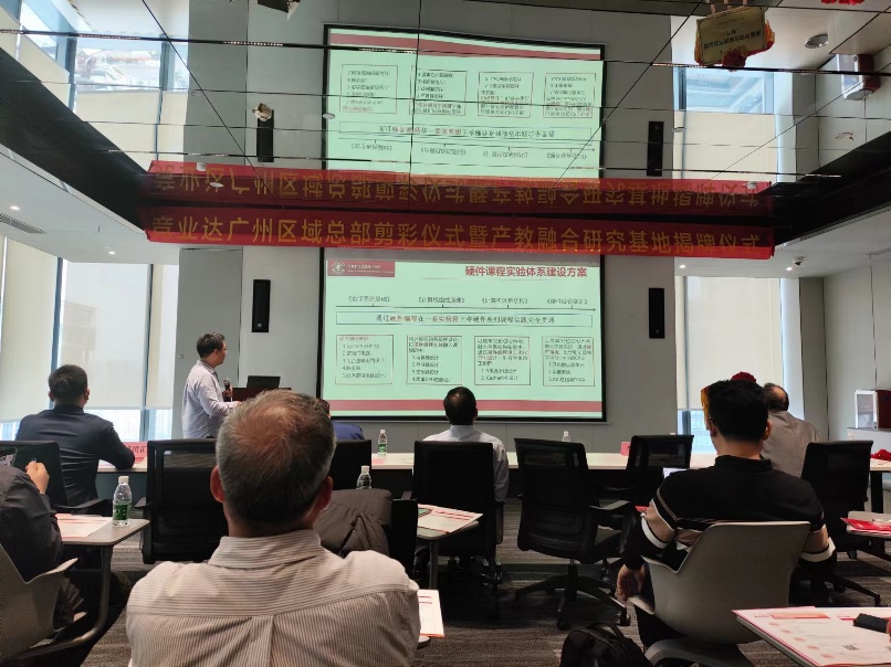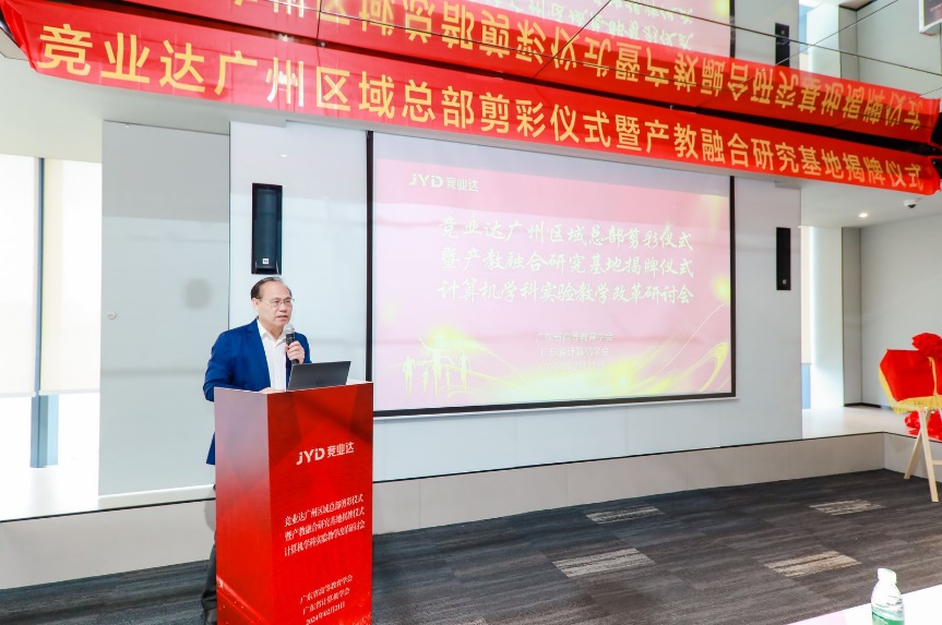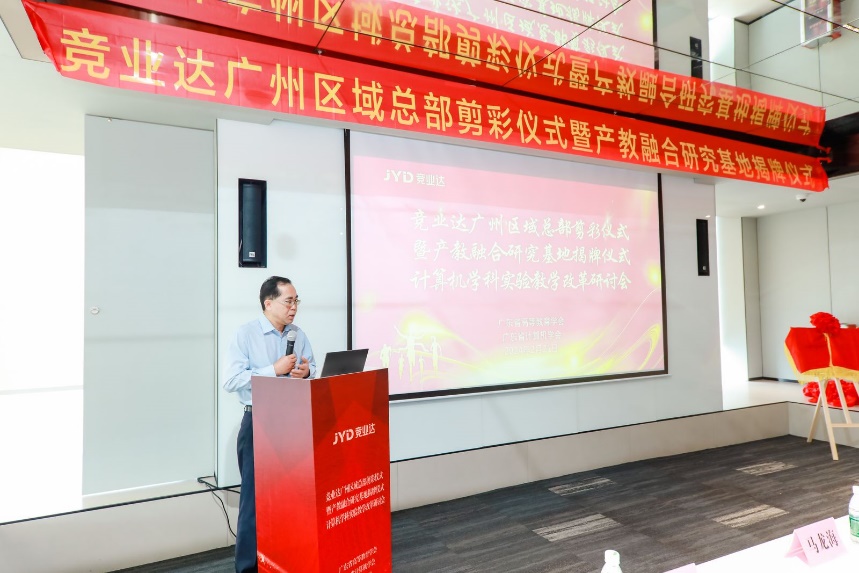 会议的第二阶段是嘉宾致辞,广东金融公司原党委副书记、广州新华公司副董事长马龙海、广东省高等教学学会常务副会长、研究员汤贞敏、北京竞亚达数码科技股份有限公司副总裁李文波等分别致辞。祝贺广东省计算机学科实验教学改革研讨会的顺利召开,祝贺北京竞亚达数码科技股份有限公司产教融合研究基地顺利揭牌。